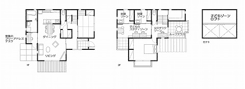 家事コーナー、PCコーナー、お父さんの仕事、子どもの学習スペースなど