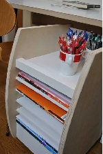 5科目ごとに本やノートプリントを差し込める仕切り棚を設け